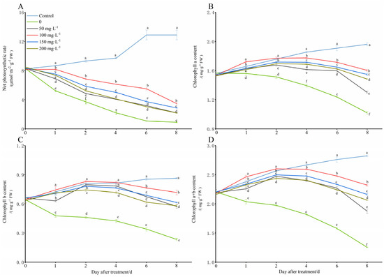 The third leaves from the top were selected to determine the net photosynthetic rate at 09:00–11:00, which were measured using a Li-6400 portable photosynthetic meter (Li-6400, LI-COR, Lincoln, NE, USA). For the chlorophyll content determination, 0.1 g of the leaves was placed into centrifuge tubes containing 5 mL of 95% alcohol and incubated at room temperature for 48 h in the dark. The absorbance of the chlorophyll extract was measured using a spectrophotometer (UV-5300, Shimadzu, Kyoto, Japan) at 665 and 649 nm against 95% alcohol. Chlorophyll a, chlorophyll b, and the total chlorophyll content were calculated according to the formula of Zou [33]. Three replicates were set up for each sample.