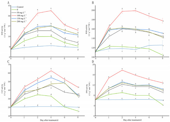 The low temperatures (8 °C) stimulated a rapid increase in the SOD, POD, CAT, and PPO activities at 1 DAT compared to those of the control (28 °C) (Figure 4). However, at 2 DAT, the SOD, CAT, and PPO activities increased slowly, and the POD activity even began to decrease, and it was significantly lower than that of the control after 6 DAT. From 4 DAT of the stress induction, the SOD, CAT, and PPO activities began to decrease rapidly, and the CAT and PPO activity levels were even severely lower than they were in the control after the sixth day of the stress. Under the cold treatments (8 °C) with various concentrations of chitooligosaccharide, the SOD, POD, CAT, and PPO activities exhibited an increase, which was followed by a decrease. Additionally, most of the SOD and POD activities increased rapidly in the first 2 DAT, and they changed slowly over the next two days, and decreased rapidly thereafter. The CAT activities in most of the treatment groups increased rapidly in the first 4 DAT of the cold stress, and then, they decreased rapidly, except for the group with a chitooligosaccharide concentration of 200 mg·L−1. Additionally, the PPO activities in most of the treatment groups increased rapidly in the first 2 DAT of the cold stress, and they declined sharply thereafter. After the treatment with different concentrations of exogenous chitooligosaccharide, their SOD, POD, CAT, and PPO activity levels were consistently higher than they were the control group, especially after the treatment with 100 mg·L−1, and the increase effect was significantly higher than it was in the other concentrations. When they were treated with chitooligosaccharide at 100 mg·L−1, the values of SOD and CAT activity reached a maximum on day 4 of the cold stress, and at this time, they were 67.25% and 44.01% higher than those of the group that was not treated with chitooligosaccharide (0 mg·L−1) at low temperatures (8 °C), respectively, and 7.14 and 3.03 times higher than those of the control group (28 °C) (Figure 4A,C). The value of PPO activity reached a maximum on day 2 of the cold stress, and at this time, it was 20.54% higher than that the group that was not treated with chitooligosaccharide at low temperatures (8 °C), and it was 1.21 times higher than that of the control group (Figure 4D). However, the PPO activity was slightly higher under the cold stress on day 4 than it was on day 2, and on days 2 and 4, it was 20.32% and 21.14% higher than that the group that was not treated with chitooligosaccharide (0 mg·L−1) at low temperatures (8 °C), respectively, and it was 1.82 and 1.83 times higher than that of the control group, respectively (Figure 4B).