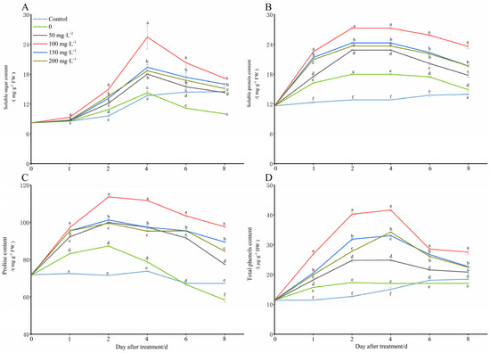 Under the simulated low-temperature conditions (8 °C), the plants would increase the content of soluble sugars (SS), soluble proteins (SP), proline (Pro), and total polyphenols (TP) in vivo in order to reduce the cold damage (Figure 5). However, the contents of soluble sugars, soluble proteins, proline, and total polyphenols began to decrease with the extension of the stress time, and they were even lower than those in the control group (28 °C). The application of different concentration treatments of exogenous chitooligosaccharide can greatly increase those indexes in the peanut seedling leaves, most of which were significantly higher than they were in the only cold treatment group (0 mg·L−1), and some of them were even significantly higher than those in the control group. The treatment group with 100 mg L−1 was significantly more improved than the other groups were, which means it had the best ability to increase the cold tolerance of the seedlings under cold stress.