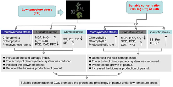 To investigate the functions of exogenous COS on the cold tolerance in peanuts, the determining growth indicators, ROS levels, antioxidant capacity, and the content of cold stress-related osmotic substances were researched. These results preliminarily revealed the mechanism of peanuts to reduce the cold damage under a COS treatment, and it will further provide a reference for improving the cold tolerance of oil crops in production facilities.