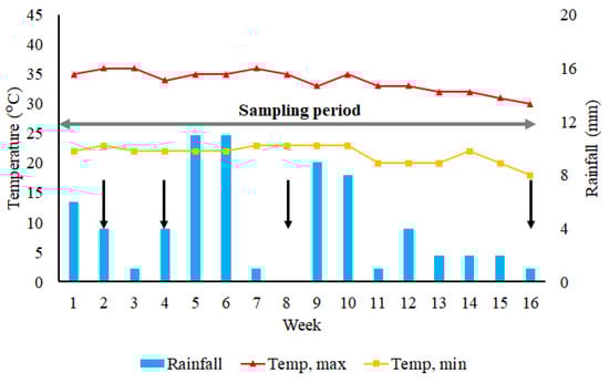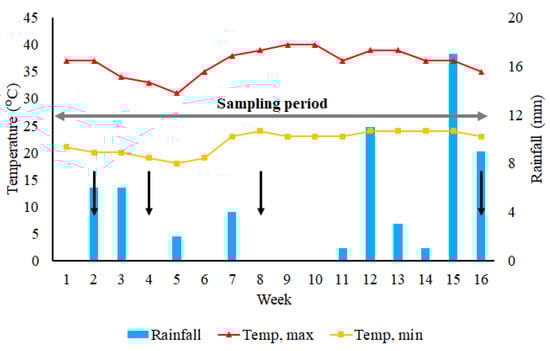 Weekly rainfall (mm) and mean weekly maximum and minimum temperature (°C) from March to June (dry period), i.e., till the start of the rainy season. The four sample dates are indicated by arrows.