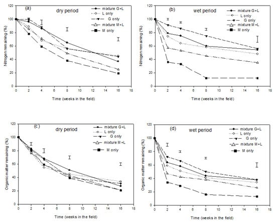The organic matter (OM) decomposition pattern of the different litters is shown in Figure 3c,d. In the dry period, no significant differences were found in the decomposition rate between the different treatments. However, Moringa leaves lost about 87% of their OM, while Guazuma on its own and the Leucaena + Guazuma leaf mixture had lost 62% of their OM (Figure 3). In the wet period, significant (p < 0.01) differences were found. OM decomposition during the first 2 weeks resulted in a sharp decrease for all treatments but particularly in the Moringa and Leucaena + Moringa mixture leaves, with losses up to 67%. Losses were 28 and 36% for Guazuma and Leucaena + Guazuma, respectively (Figure 3c,d). Throughout this period, loss of mass in Guazuma leaves proceeded more slowly than for the other treatments, with 56% of the initial leaf mass remaining after 60 days. Decomposition rates of Moringa and Leucaena + Guazuma mixed leaves decreased after 8 weeks, and decomposition had virtually stopped after 16 weeks. Guazuma leaves and the mixture of Leucaena + Guazuma had the smallest decomposition, and at the end of the experiment, about 40% of their initial leaf mass had still not decomposed.