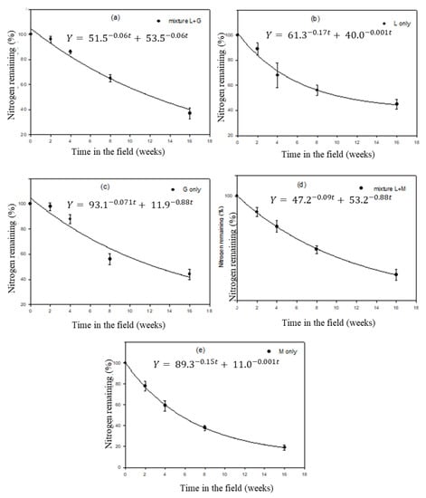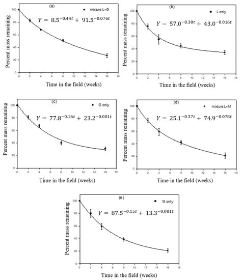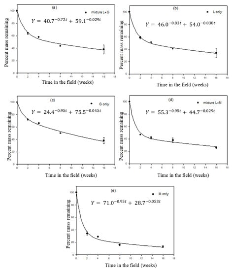 Figure 5 shows the decomposition pattern for the rainy period. Leucana + Guazuma (5a) mixture had a higher decomposition rate, compared to Guazuma alone. Leucaena (5b) decomposed faster over the first 8 weeks, while Guazuma had the slowest rate of decomposition (5c). A rapid loss of leaf material in litterbags was observed with mixed Leucaena + Moringa leaves and Moringa leaves during the initial decomposition stage (Figure 5d,e). The rate of the mass loss of Moringa leaves was large during the first two weeks. In this period, the recalcitrant materials were 76% and 29% for pure Guazuma and pure Moringa, respectively.