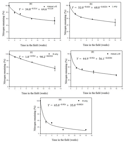 The pattern of steadily declining decomposition rates of all treatments in both periods suggests that first the soluble and easily degraded compounds are utilized, with the remaining biomass being more resistant to decomposition. Over an 8-week period, between 50 and 60% of the leaf mass was lost in the dry season, compared with 60 and 80% in the wet period. Similar trends of decomposition rates in tropical conditions have been reported [,], using leaves from leguminous and non-leguminous species. Regarding N release, the three species studied exhibited contrasting behaviors. Moringa leaves released much of their N almost instantly; N release from Leucaena leaves was intermediate, while Guazuma leaves released their N still more slowly. No data were found in the literature for Moringa and Guazuma to make a comparison of their decomposition behavior.
