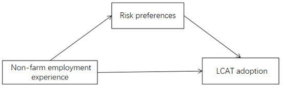 Non-farm employment experience directly affects farmers’ adoption behavior of LCAT and promotes its adoption by strengthening their risk preferences. First, Non-farm employment experience improves farmers’ awareness of LCAT [34]. The premise of adopting LCAT is to recognize the LCAT. Farmers with non-farm employment experience have a stronger awareness of environmental protection and ecological civilization and are more likely to understand the long-term benefits of LCAT [51]. This may reduce the risk of LCAT adoption. Second, Non-farm employment experience strengthens farmers’ ability to obtain market information [46]. Compared with local farmers, they may moderately perform commercial agriculture production following specific market needs to rectify the information asymmetry of the market price for agricultural products and achieve a “high-quality price” for their products [52]. They also make necessary adjustments to their production and management mode following the changes in market demand to reduce uncertainty risk [48]. Third, non-farm employment experience accumulates human capital [53]. The higher human capital of farmers helps them learn about technical operation specifications through various channels, accurately use various LCATs, and reduce the risk of improper use of technologies [34]. Therefore, we propose our third hypothesis as follows.