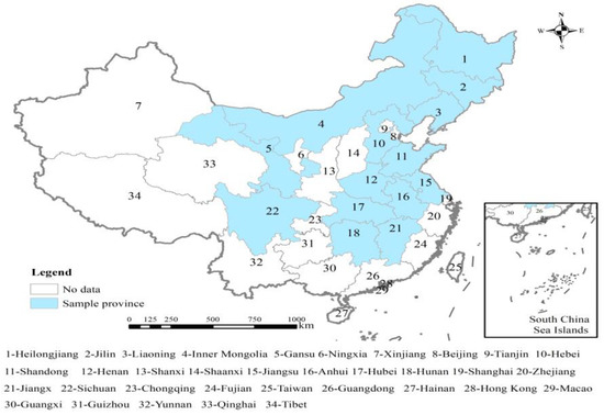 This study utilized data from a 2019 survey of grain farmers in 14 provinces of China by the National Agricultural and Rural Development Research Institute of China Agricultural University. First, considering China’s major grain-producing areas, we selected 14 provinces, including Hebei, Shandong, Jiangsu, Henan, Anhui, Hubei, Jiangxi, Hunan, Inner Mongolia, Sichuan, Gansu, Heilongjiang, Jilin, and Liaoning, covering eastern, central, western and northeastern China (there are 13 major grain-producing areas in China, namely Hebei, Shandong, Jiangsu, Henan, Anhui, Hubei, Jiangxi, Hunan, Inner Mongolia, Sichuan, Heilongjiang, Jilin and Liaoning) The sample distribution is shown in Figure 2. Second, in the selected provinces, 124 counties and 142 villages were selected by using a typical sampling method, and 12 to 15 grain farmers were randomly selected as research participants in each village. The survey was conducted as one-on-one interviews with the investigators, and a total of 1952 research questionnaires were collected. Finally, excluding questionnaires with missing data and inconsistent information, 1843 valid questionnaires were obtained, for a valid rate of 94.42%. The survey included two levels: family and village. The family level includes farmers’ characteristics, labor employment, land operation scale, grain production, LCAT adoption, and others. The village level considers the village terrain, economic level, population characteristics, land size, and other relevant information.