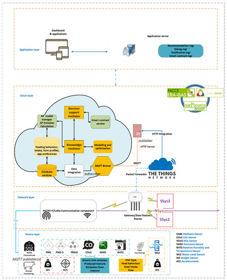- Device Layer: includes sensors (i.e., for measurement of the concentrations of APs such as NH3, CO, CO and PMx), devices and client agents (to collect and transmit data to the IoT platform).
