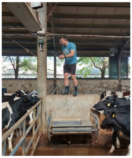 Microscopic particles are particles suspended in the air and produced in various types of industries and agriculture. A high concentration of them affects human and animal health. In animal husbandry in general, and in cow farms in particular, the sources of air pollution with microscopic particles could be feed administration [27] and feed management (wet vs. dry food, feed distribution system, feed storage), waste burning [28], stable cleaning, manure management, animal movement, animal maintenance (on bedding or not), ventilation rate or the microclimate in the shelter, while an indirect origin is oxidation of ammonia or other precursor gases [29,30,31].