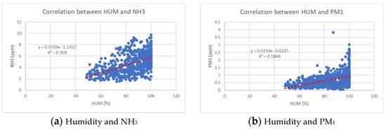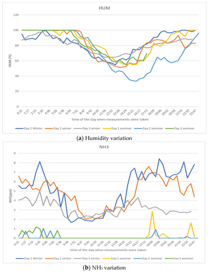 Regarding the observed difference between the values estimated by the EMEP/EEA guideline equations (2019) and the values recorded by the sensors, this phenomenon is because the estimates do not consider the natural and artificial ventilation of the stable, being used instead for an overall assessment of atmospheric air quality. Estimates and measurements may be similar only under experimental conditions, or if the stable were permanently closed. For this reason, for point sources of air pollutants from livestock (farms) it is recommended that farmers use sensors and create alert systems that adjust pollutant concentrations in real time (support for farm management decisions) to ensure animal welfare.