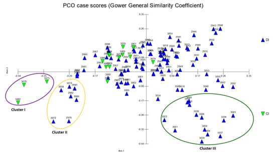 In the Principal Coordinates Analysis (PCO), it is not possible to observe a complete separation between DI and CI individuals but three separated plant clusters in the lower quadrants (Figure 2) can be observed. Cluster I (purple circle) gathers individuals from CI (Figure 2 and Figure 3B and Figure S1B), Clusters II (yellow circle) gathers individuals from the western part of DI, where allele frequency is low (Figure 2, Figure 3A and Figure S1A), while Cluster III (green circle) gathers individuals from the center part of DI, where allele frequency is high (Figure 2, Figure 3A and Figure S1A). Other individuals from DI and CI form a big group distributed throughout the upper quadrants (Figure 2).