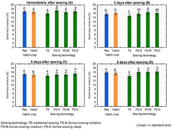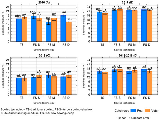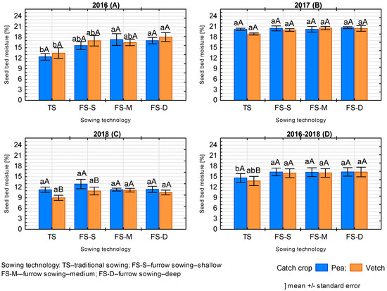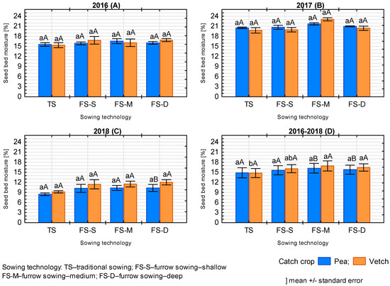 The experimental factors had a much greater effect on the seedbed moisture content measured 8 days after sowing (Figure 6). In 2016, under the conditions of an average moisture content of the seedbed at the level of 15.9%, a positive effect of furrow sowing, especially in FS-D, was demonstrated. However, no dependence of the seedbed moisture content on the species cultivated in the catch crop was demonstrated in this period (Figure 6A). In 2017, in the conditions of the high moisture content of the seedbed on the 8th day after sowing, no significant effect on this trait was found for any of the examined factors (Figure 6B). In 2018, the sowing method did not affect the moisture content of the seedbed on the 8th day after sowing (Figure 6C). On the other hand, significantly higher moisture content was found in the plots with field pea than in those with spring vetch. However, this impact was found only in the TS and FS-S. On average, during the three-year study period, a positive effect of furrow sowing on the moisture of the seedbed was demonstrated (Figure 6D). It was also shown that the seedbed moisture content was significantly higher in the plots with field pea than in plots with spring vetch. However, the effect of the catch crop on this characteristic was significant only in TS.