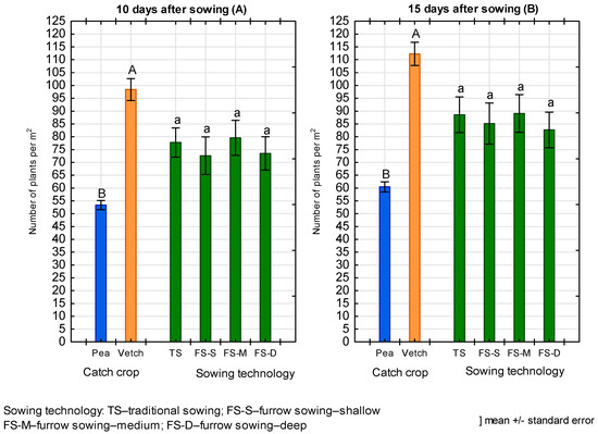 Plant density 10 (A) and 15 (B) days after sowing seeds [pcs·m−2]—average for 2016–2018. a—the same small letter for different sowing methods indicates the lack of significant differences between means (p = 0.05). A,B—different capital letter for different crops indicates significant differences between means (p = 0.05).