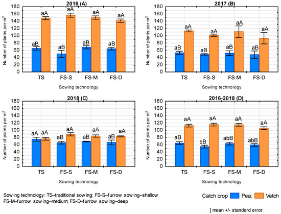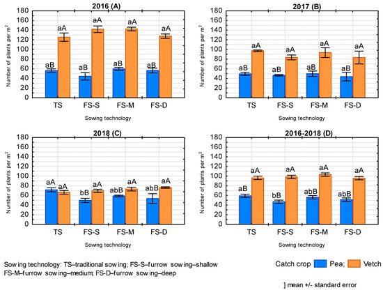 Interaction between factors in shaping the plant density 15 days after sowing seeds [pcs·m−2]. a,b—homogenics groups HSD (p = 0.05) interaction for sowing method/species (the differences between the four methods of sowing separately for pea and for vetch). A,B—homogenic groups HSD (p = 0.05) interaction for species/sowing method (differences between pea and vetch for each sowing method).