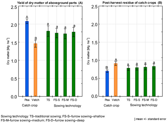 Yield of dry matter of aboveground parts and post-harvest residue of catch crops [Mg ha−1]—average for 2016–2018. a—the same small letter for different sowing methods indicates the lack of significant differences between means (p = 0.05). A,B—different capital letter for different crops indicates significant differences between means (p = 0.05).