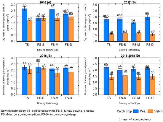 Interaction between factors in shaping the dry matter yield of catch crops [Mg ha−1]. a,b—homogenic groups HSD (p = 0.05) interaction for sowing method/species (the differences between the four methods of sowing separately for pea and for vetch). A,B—homogenic groups HSD (p = 0.05) interaction for species/sowing method (differences between pea and vetch for each sowing method).