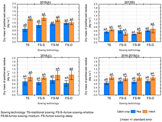 Interaction between factors in shaping the post-harvest residue dry mass yield of catch crops [Mg ha−1]. a—homogenic groups HSD (p = 0.05) interaction for sowing method/species (the differences between the four methods of sowing separately for peas and separately for vetch). A,B—homogenic groups HSD (p = 0.05) interaction for species/sowing method (differences between peas and vetch for each sowing method).