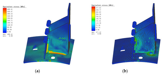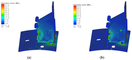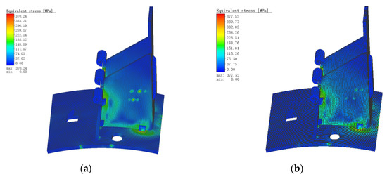 Figure 8 is the equivalent stress diagram of continuous welding and spot welding. It can be seen from Figure 8 that the stress distribution of spot welding is smaller than that of continuous welding, and the difference in their maximum stress value is 121.89 MPa. Their stress distribution is similar, the stress distribution appears to diffuse from the weld to the distance and then weaken, but it is obvious that the stress distribution of continuous welding is wider and wider. This study finally chose the welding form of spot welding.