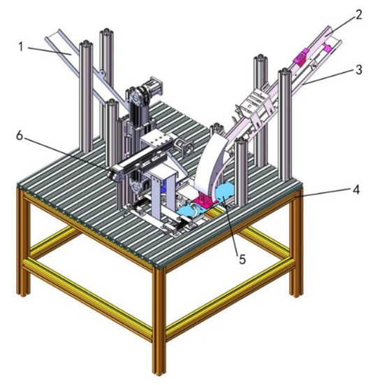 Structure diagram of duckbill welding robot for cotton seeder. 1. Girdle feeding mechanism; 2. static duckbill feeding mechanism; 3. hinge feeding mechanism; 4. support platform; 5. welding fixture; 6. welding actuator.