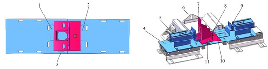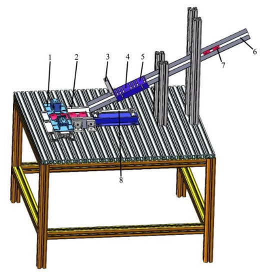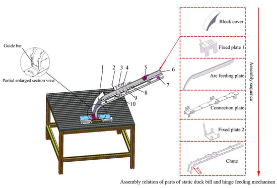 To save space, the static duckbill feeding mechanism and the hinge feeding mechanism adopt an integrated design, and the assembly relationship of the parts is shown in Figure 13. The static duckbill and the hinge feeding mechanism are equipped with fixed plates to fix inductive proximity switches, electromagnets, and cylinders.