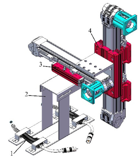 Welding actuator structure diagram. 1. Welding torch; 2. welding torch bracket; 3. X axis linear slider; 4. Z axis linear slider.