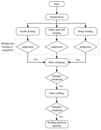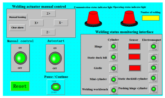 The cotton seeder duckbill welding robot controller is the Siemens S7-1200PLC. The communication between PLC and human–machine interaction (HMI) is Ethernet. PLC realizes manual and automatic control of the girdle, static duckbill, and hinge feeding operation. It also controls welding parameters, fixtures, welding actuators, and welding platforms. HMI enables manual and automatic program switching of welding robots and monitors the working conditions of welding robots to ensure the safe and smooth operation of welding operations. The control system flow chart is shown in Figure 16.