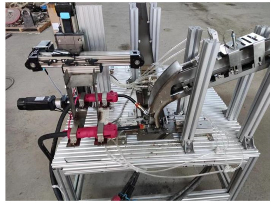 The structure size of the girdle feeding mechanism is 800 mm × 68 mm × 22 mm. It adopts a modular design and is installed on the support platform through the aluminum profile pillar. The working process is as follows: When the inductive proximity switch detects that there is a girdle in the storage chute, the electromagnet is energized and absorbs the second girdle, and the cylinder shrinks. The first girdle falls freely to the girdle waiting area due to gravity, and finally, the mini cylinder pushes the girdle into the welding area. The girdle feeding mechanism is shown in Figure 12.