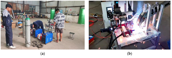 Factory test of cotton seeder duckbill welding robot. (a) Welding test site; (b) welding test in progress.