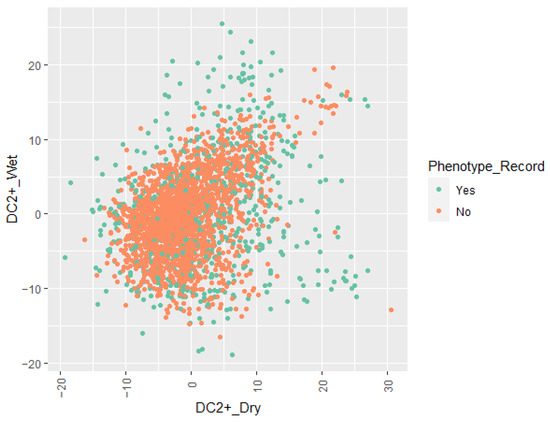 Plot of DC2+_Dry breeding values and DC2+_Wet breeding values.