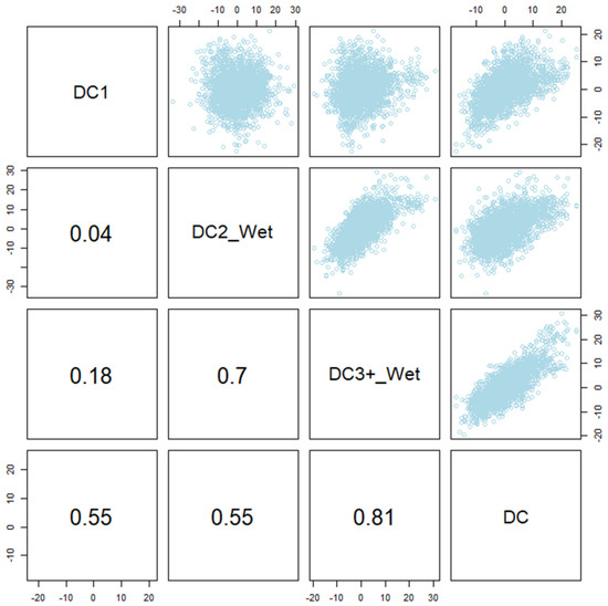 Correlation and plot matrix of breeding values of the final three traits of days to calving that were included in index three and the overall days to calving (DC). Above the diagonal is the plot of breeding values and below is the correlation of those breeding values.