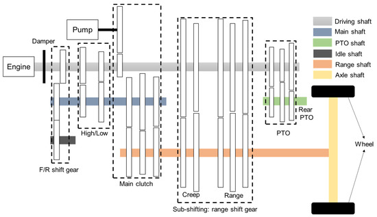 The tractor powertrain is composed of 2 high and low (power shifts), 3 power-shift type main clutches, and 3 mechanical type range shifts. Engine power is generally transmitted to the main clutch which deals with the forward-reverse and high-low shifts. Sequentially, the driving shaft drives the rear PTO connecting with the driving shift gear, range shaft gear, and PTO shift gear. Since the tractor sub-shift is performed with a mechanical gear, it is called the partial PST. The block diagram of the tractor powertrain is shown in Figure 1.