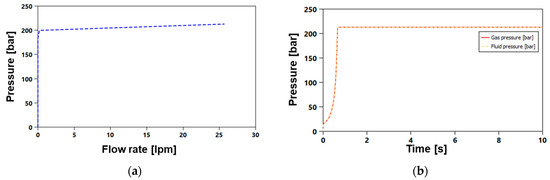 Figure 3a shows the tuning of the relief valve. It can be observed that the relief valve started to open at the cracking pressure and it fully opened when the system pressure was 212.85 bar. The pre-charge pressure of the internal gas and the hydraulic fluid pressure of the accumulator were the same due to the system pressure of the hydraulic system, accounting for almost 212.85 bar, shown in Figure 3b.
