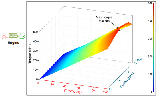 The throttle level of the engine controls the engine power by regulating the amount of fuel that enters the engine. The throttle opening of the engine is subjected to the throttle angles [25,30]. The engine map was designed for 100% load condition and Equation (1) was used to calculate the engine torque at each throttle level. The maximum torque for 100% throttle opening was found to be at around 500 Nm at an engine speed of 1600 rpm. The developed engine map was applied to conduct the simulation, which is shown in Figure 4.