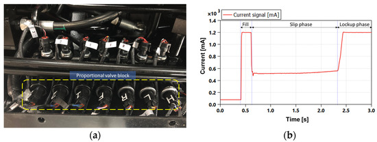 Proportional valves assembly with command current signal. (a) Proportional valve block of T130, (b) command signal of proportional valve.