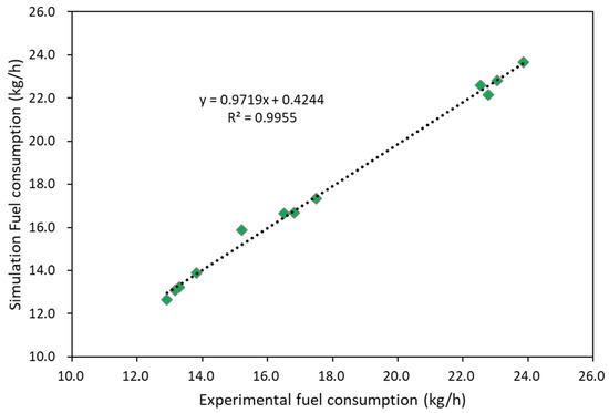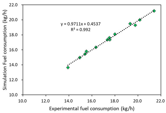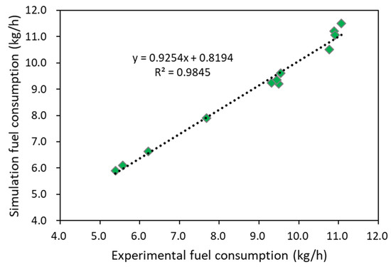 In the comparison among engine modes, it was observed that fuel consumption with the APS ECO mode for both measured and simulation were more economic compared to the traditional mode, accounting for around 42.35 and 42.06%, respectively. It was also observed that fuel consumption with the APS power mode for both measured and simulation were almost 28.41 and 27.04%, respectively, which was more economic than the traditional mode. The statistical analysis shows that the simulation and measured fuel consumptions were linearly corelated, with an R2 of 0.9955. The statistical analysis results are shown in Figure 10.