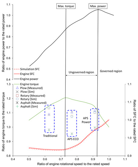 To generalize our model for actual operations, it is necessary to consider low fuel consumption rate and high torque. Therefore, the experimental load generated during asphalt driving, plow, and rotary tillage at various engine modes were plotted in the performance curve, which is shown Figure 11. Fuel consumption was gradually increased after an engine speed of 1500 rpm. This indicates that the engine should run at a low speed to minimize fuel consumption. However, tractor working efficiency would be decreased at a low speed. It may unexpectedly be turned off the engine due to the load variation. For this reason, the engine speed should remain under the ungoverned region. The efficiency was comparatively high but the fuel consumption was relatively lower.