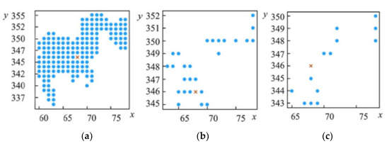 The K-MEANS cluster change diagram of credible data P. (a) K = 5, Num = 175, d = 10; (b) K = 20, Num = 26, d = 3; (c) K = 40, Num = 13, d = 2.