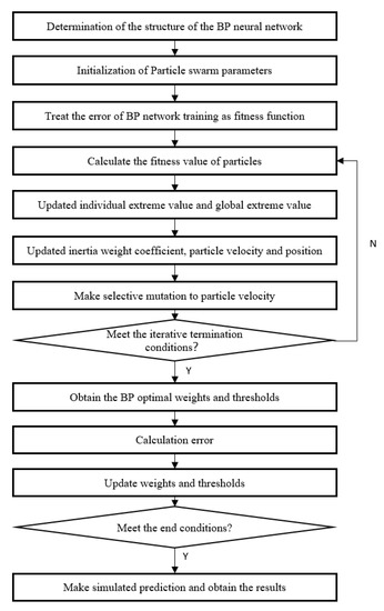 Figure 5 shows the algorithm flow of spare parts consumption prediction based on BP neural network. The convergence performance and the final stable state can be affected directly and fall into the local minimum easily; for this reason, the initial connection weights and thresholds of the traditional BP algorithm were set randomly. Updating the connection weights and threshold is the main duty in the learning process, but the traditional BP network tries to find the appropriate value through continuous training. The ideal result cannot be obtained under excessive training or a lack of training, and more unexpected phenomena such as overfitting can also be caused, which affects the network’s generalization ability. To overcome these weaknesses, this paper planned the IPSO algorithm to optimize the connection weight and threshold of BP neural network. Thus, the global optimization ability of PSO and local search of the BP algorithm can be fully used to overcome the problem of the BP neural network’s random assigning weights, and improve the generalization ability of the BP neural network as well as the learning ability of the neural network. The flowchart of a new BP neural network algorithm optimized by IPSO is shown in Figure 6.