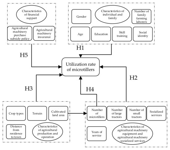Without agricultural modernization, national modernization is incomplete, incomprehensive, and unstable [1]. Agricultural modernization is also an important part of rural revitalization [2,3]. Agricultural machinery is a significant new factor that can break the low production cycle of traditional agriculture [4], and agricultural mechanization is the only way for agricultural capital to further realize agricultural modernization [5]. Promoting the level of agricultural mechanization is conducive to strengthening the production capacity of agricultural products [6], improving land use and management [7], ensuring food security supply [8,9], and developing the growth of green efficiency and agricultural innovation sustainability [10]. In developing countries in particular, the use of agricultural machinery can help solve production difficulties such as the shortage of fertilizer, labor, and water resources [11]. Since 2004, the agricultural mechanization in China has increased rapidly. However, the problems of low utilization of agricultural machinery and the low quality of agricultural mechanization development have come into focus. During the process of agricultural production, the phenomenon of idle agricultural machines in some places and the shortage of agricultural machines in other places exist at the same time [12]. At present, the agricultural mechanization rate in hilly and mountainous areas, where the cultivated land accounts for one-third of China’s cultivated land, is only about 50%, which is more than 30 percentage points lower than that in plain areas [13]. Due to the complex terrain and weak economic level of cultivated land in hilly and mountainous areas, small agricultural machines such as microtillers are widely popular because of their lightness, small size, and low price. As a representative of small agricultural machines, the number of microtillers in China reached 7.9667 million in 2020 [14]. Therefore, the research on the influencing factors of the utilization rate of microtillers widely used in hilly and mountainous areas cannot only help to improve the utilization rate of microtillers and promote the development of agricultural mechanization in hilly and mountainous areas, but also play a reference role in improving the idle situation of agricultural machinery in other regions or other types.