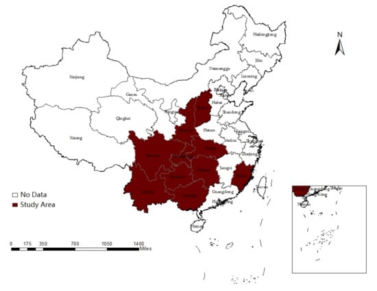 The data used in this study comes from the sampling questionnaire survey conducted by the Department of Agricultural Mechanization of the Ministry of Agriculture and Rural Affairs of the People’s Republic of China from May to July 2020 on farmers in 10 provinces (Yunnan, Guizhou, Sichuan, Chongqing, Hunan, Hubei, Guangxi, Fujian, Shaanxi, and Shanxi). Figure 2 shows the survey location. Statisticians, who worked in county-level agricultural departments, helped farmers answer questions through the specially designed mobile application. In order to ensure the reliability of the data, before the formal survey, the questionnaire was preinvestigated and revised, and the statisticians in county-level agricultural departments were trained. During the formal survey, the questionnaire was processed, including the preliminary review by the statisticians of the county-level agricultural departments, the final review by the project team members of the Department of Agricultural Mechanization of the Ministry of Agriculture and Rural Affairs, the rejection and refilling of the problems found, the subsequent telephone sampling return visit, the cancellation of the unqualified questionnaire, and so on. A total of 5030 questionnaires were collected, of which 4905 were valid, and the effective rate was 97.51%. Among 4905 samples, 2467 monitored farmers had microtillers, with a total of 5797 microtillers.