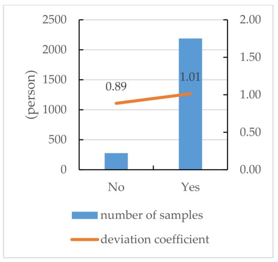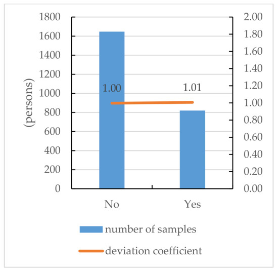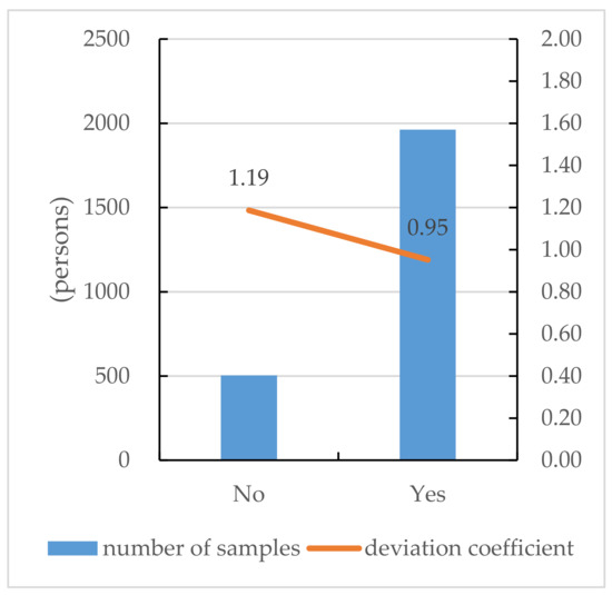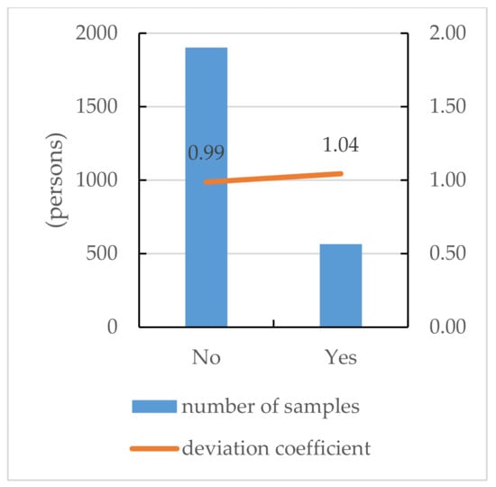 From the gender grouping of the monitored farmers (Figure 4), although the number of women using microtillers is less than that of men, the average microtiller utilization rate of women is slightly higher than that of men. This may be because female farmers prefer to choose simple and easy-to-operate microtillers instead of labor, compared to riding tractors that are complicated to operate and difficult to maintain. From the age grouping of the monitored farmers (Figure 5), both the sample size and the deviation coefficient peak between the ages of 41 and 50. The 41–50-year-old farmers mentioned here and later refer to the monitored farmers with microtillers who are older than or equal to 41 and younger than 50 years old. The reason may be that compared with farmers at a younger age, farmers aged 41–50 have more experience in using microtillers and have a higher utilization rate. However, with the further increase of age, the physical fitness decreases, resulting in the drop of the frequency of using microtillers. Based on this, we use “whether the age group is 41–50 years old or not” as a 0, 1 explanatory variable (new age variable/No = 0, Yes = 1) to replace the previous age variable, and incorporates it into the regression equation later. In terms of the education grouping of the monitored farmers (Figure 6), except for farmers who are not educated, with the rise of education level, the microtiller utilization rate of farmers ascends. From the skill training grouping of the monitored farmers (Figure 7), farmers who have participated in skill training have a higher utilization rate of microtillers than those who have not participated in training. The reason is that training that is related to agricultural machinery can help farmers increase agricultural machinery knowledge and improve agricultural machinery operation skills. Among the family farming laborers in the group of monitored farmers (Figure 8), the utilization rate of microtillers gradually increases with the ascent of the number of family farming laborers. For the social identity grouping of the monitored farmers (Figure 9), although only 8% of the sample now or once have the identity of enterprise management, the utilization rate is significantly higher than the average level, which is 0.36 times higher than the average value. This is because the farmers at the enterprise management level have a strong social network and can obtain more information about the needs of agricultural machinery, and find more service objects who are willing to purchase socialized services. Moreover, they have strong management ability which enables them to arrange and use agricultural machinery more reasonably.