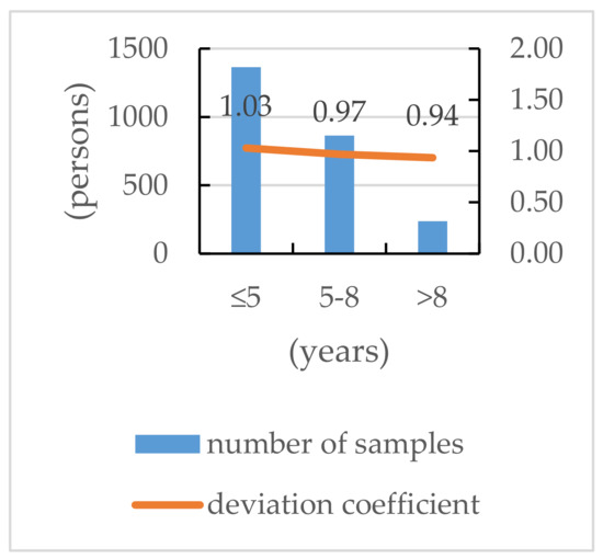 Deviation coefficient of agricultural machinery utilization rate grouped by years of service.