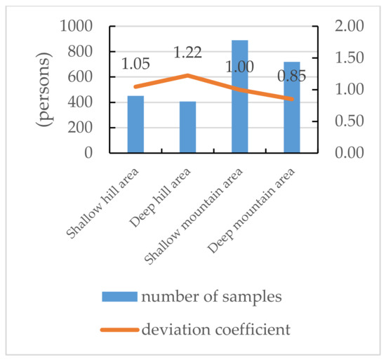 where Bj is the deviation coefficient of the utilization rate of microtillers of a certain variable in group j, and n is the number of samples in this group. is the utilization rate of the farmer i in group j, is the total utilization rate of the farmers in group j, and the value of i ranges from 1 to n; U is the average utilization rate of all farmers with microtillers. In order to facilitate intuitive analysis, it is set here that when the deviation coefficient is between 0.8 and 1.2, the difference between the average value of this group and the average value of all samples is considered to be insignificant. When the deviation coefficient is greater than 1.2 or less than 0.8, it is considered that the average value of this group is significantly higher or lower than that of all samples.