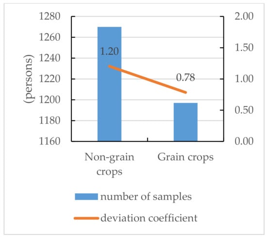 Deviation coefficient of agricultural machinery utilization rate grouped by crop types.