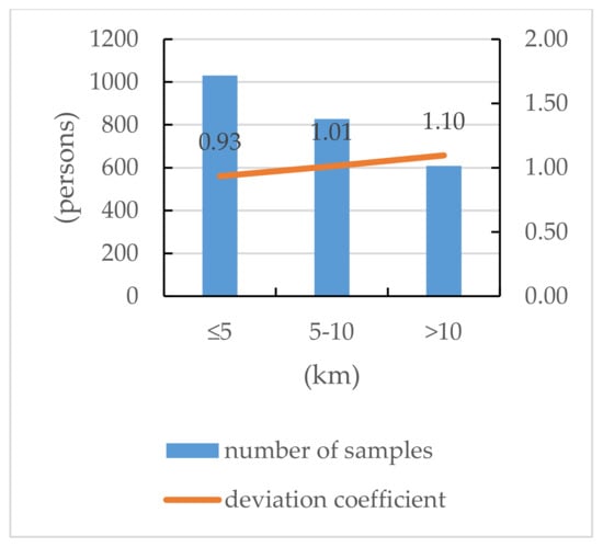 Deviation coefficient of agricultural machinery utilization rate grouped by distance from residence to town.