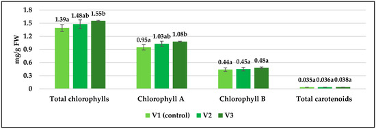 Determination of photosynthetic pigment content was performed after chlorophyll and carotenoid pigment extraction in 80% acetone and spectrophotometrically measured at 663 nm, 647 nm, and 480 nm with a UV-VIS Spectrophotometer ThermoHelios Alpha purchased from Thermo Spectronic, Cambridge, UK. The extinction coefficients and equations described by Schopfer (1989) [28] were used for calculation. The results were expressed in mg/100 g fresh weight.