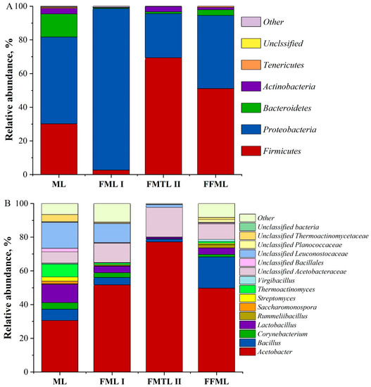 We found that Firmicutes, Proteobacteria, Bacteroidetes, and Actinobacteria were the most abundant phyla after fermentation, which is consistent with the bacterial phyla composition of many fermented foods [31,32]. However, FML I had a lower relative abundance of Firmicutes, while FML II and FFML had a higher relative abundance of Firmicutes compared with the ML group. The lower Firmicutes abundance in the FML I may be caused by the growth inhibition of the obligate anaerobic bacteria of the Firmicutes in the ventilated environment compared with the other groups. This result is consistent with a previous study, which found that Firmicutes abundance significantly decreased in an aerobic environment and was accompanied by an increase in Proteobacteria abundance [33]. In the present study, the FML I, FML II, and FFML had higher Acetobacter and lower Lactobacillus abundances than the ML group. Moreover, the FFML had a higher relative abundance of Bacillus than the other groups. Bacillus mainly decomposes macromolecular substances to produce flavor compounds [34]. Thus, the higher relative abundance of Bacillus in FFML might be associated with a better fermentation effect. The Acetobacter can produce acetate and is more competitive under acidic conditions, while the proliferation of Lactobacillus increases the acidity [34], which indicates that the lower Acetobacter and higher Lactobacillus abundances in FFML than in the FML II may be due to acidity-controlling ability of these bacteria species.