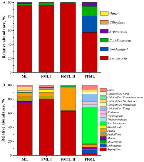 The fungal composition of ML and FMLs at the phylum level is shown in Figure 2A. Ascomycota (57.14–99.50%) and Basidiomycota (excluded FML II; 1.93–13.86%) were the most dominant phyla in all groups, and Zygomycota accounted for 1.71% and 5.41% in the ML and FFML, respectively. Compared with the ML group, the relative abundance of Ascomycota (+3.31%) was higher and Basidiomycota (−83.81%) was lower in the FML II group; whereas the relative abundance of Ascomycota (−0.20% and −40.67%) was lower, and Basidiomycota (+91.13% and +619.07%) was higher in the FML I and FFML groups. Furthermore, the relative abundance of Zygomycota (+216.50%) was higher in the FFML group, whereas Zygomycota (−97.50% and −99.50%) was lower in the FML I and FML II groups compared with the ML group.