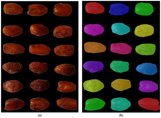 The optical, textural, and geometric parameters, including linear dimensions and shape factors, can be determined using image analysis [7,8]. Non-destructive measurements and fast image processing allow for the extraction of useful image features for building objective models for the discrimination of samples and the evaluation of object quality using machine learning [7,9]. It can be of great practical importance for varietal discrimination, the detection of species, disease, or the evaluation of plant quality [10]. Features determined using image analysis can be useful to evaluate fruit quality. Color properties computed from images were used to differentiate varieties, sort and grade date fruits, and distinguish between acceptable and damaged or immature fruits [11,12]. Date fruit color, as well as texture, shape, and size extracted from images, were used for fruit classification based on ripeness [13]. The physical (e.g., dimensions, shape, texture, seed/weight ratios, total color changes, total soluble solids, and firmness), nutritional (e.g., total phenolic content, glucose and fructose content, and DPPH antiradical activity), biological (nitric oxide (NO) scavenging, NO inhibition), and microbial (e.g., total viable count) parameters are considered as quality attributes of date fruit [14,15]. The physicochemical properties, such as moisture content, dimensions, weight, volume, tannin content, total soluble solids, and reducing sugars can be a determinant of date-fruit maturity. However, some changes may be not statistically significant important [16]. It was also reported that moisture, sugar, and ash content may be commercially important varietal characteristics of date fruit [17]. Differences in the properties of date fruits of individual varieties may also affect the quality and physicochemical parameters of their products [18,19]. Therefore, an in-depth determination of the properties of a given variety can have an impact on the consumption and processing of date fruits.