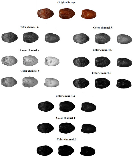 Before the texture-parameter computation, the date fruit images were converted to individual color channels L, a, b, R, G, B, X, Y, and Z. The sample fruit images in different color channels are shown in Figure 2. For each ROI considered as a whole surface of date fruit, 1629 image textures were determined, including 181 textures for each of the 9 color channels. Textures were computed based on the histogram (9 texture parameters), co-occurrence matrix (132 texture parameters), gradient map (5 texture parameters), Haar wavelet transform (10 texture parameters), run-length matrix (20 texture parameters), and autoregressive model (5 texture parameters) [21].