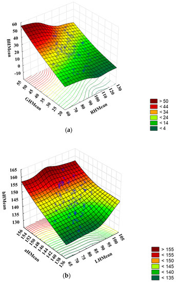 The mean values and standard errors of the selected image texture parameters from each color channel, as well as the linear dimensions and shape factors, were computed using the STATISTICA (StatSoft Inc., Tulsa, OK, USA) software. Additionally, the STATISTICA was used to determine the surface chart 3W of the textures. The charts were created for three textures from the color space RGB, three textures from the color space Lab, and three textures from the color space XYZ.